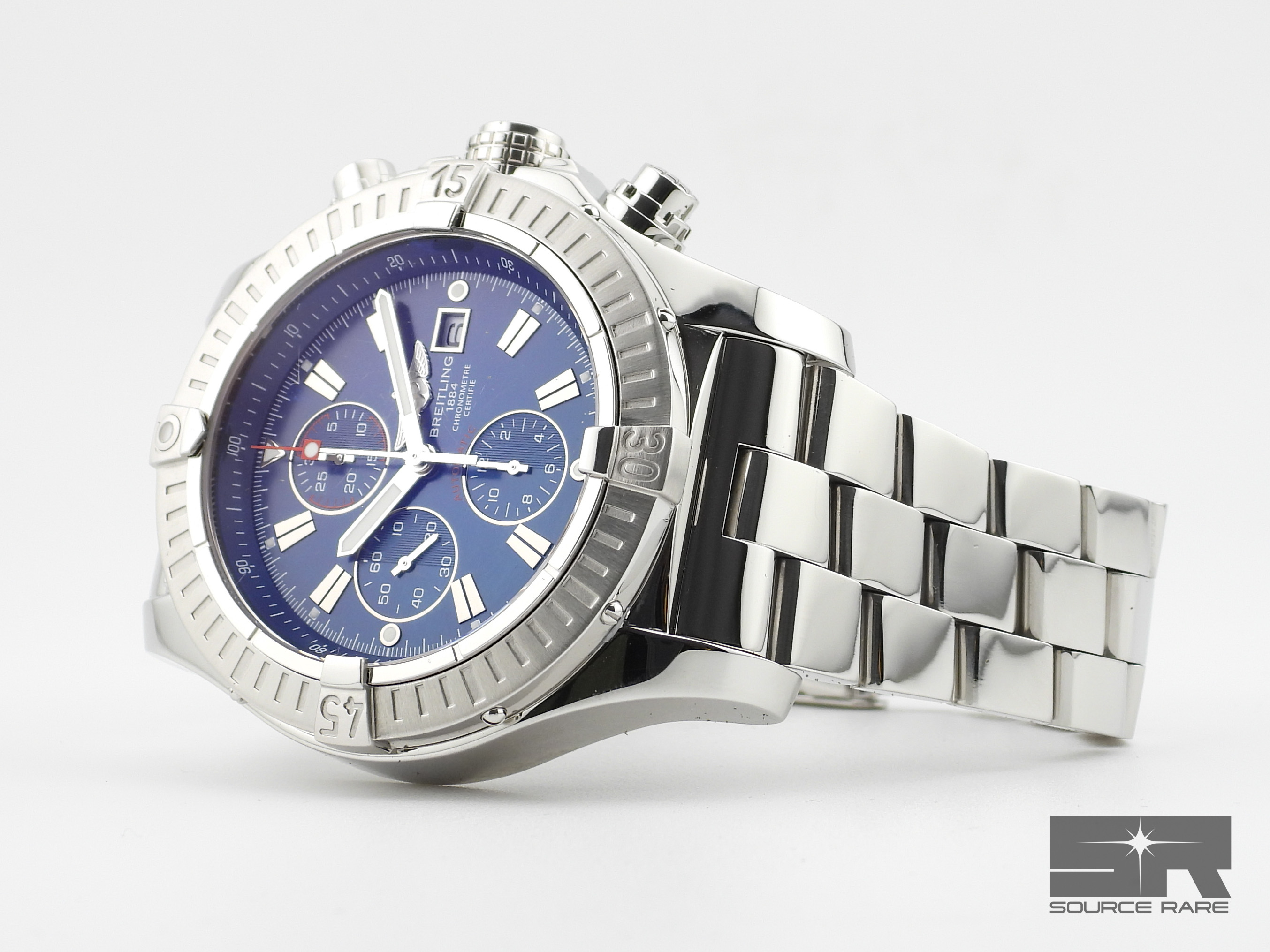 The Breitling Super Avenger Ref. A13370 is a bold, oversized chronograph built for professional performance. With its commanding 48.4 mm stainless steel case, striking blue dial, and robust construction, it’s designed to handle extreme conditions without compromising on style.