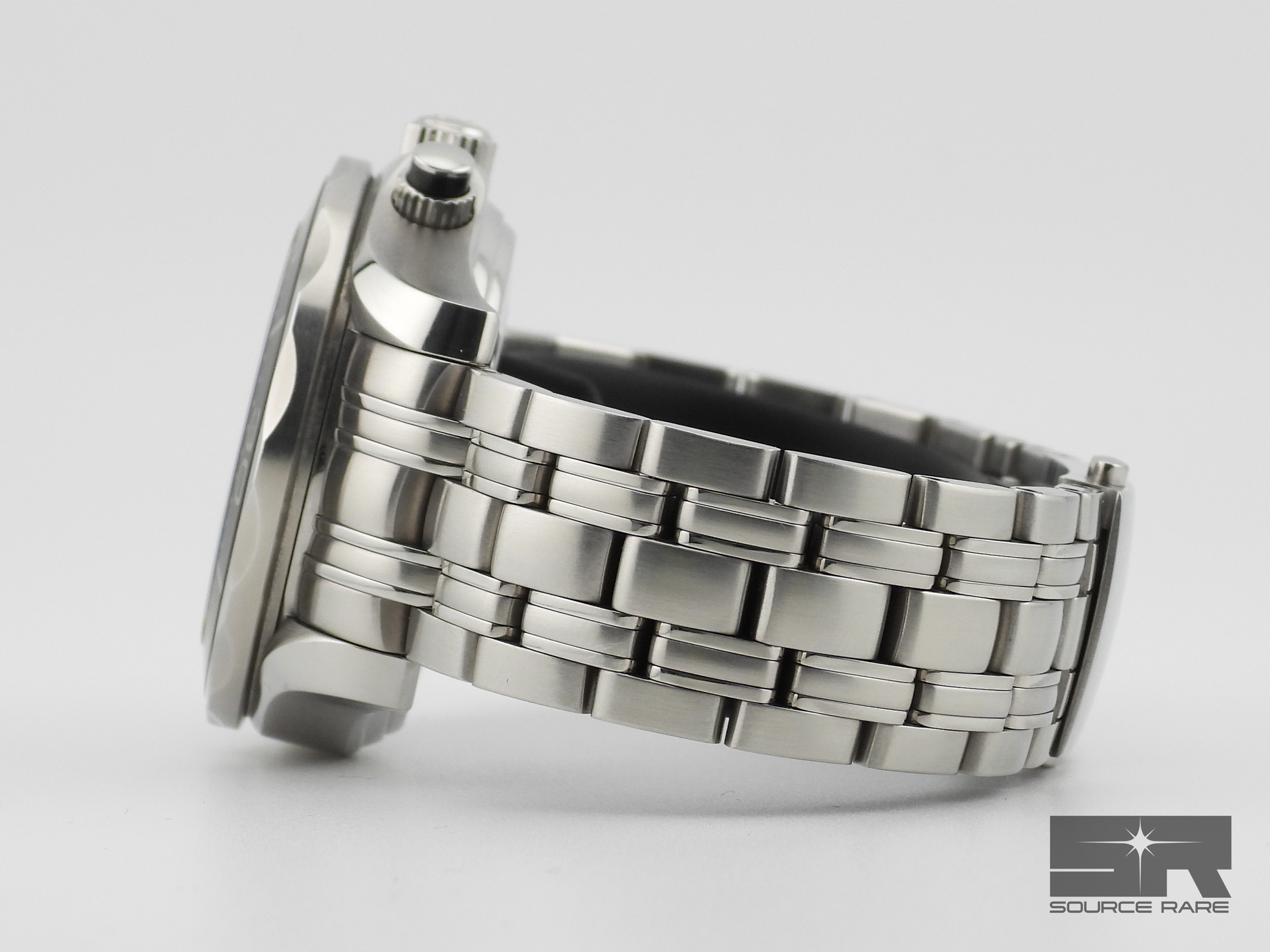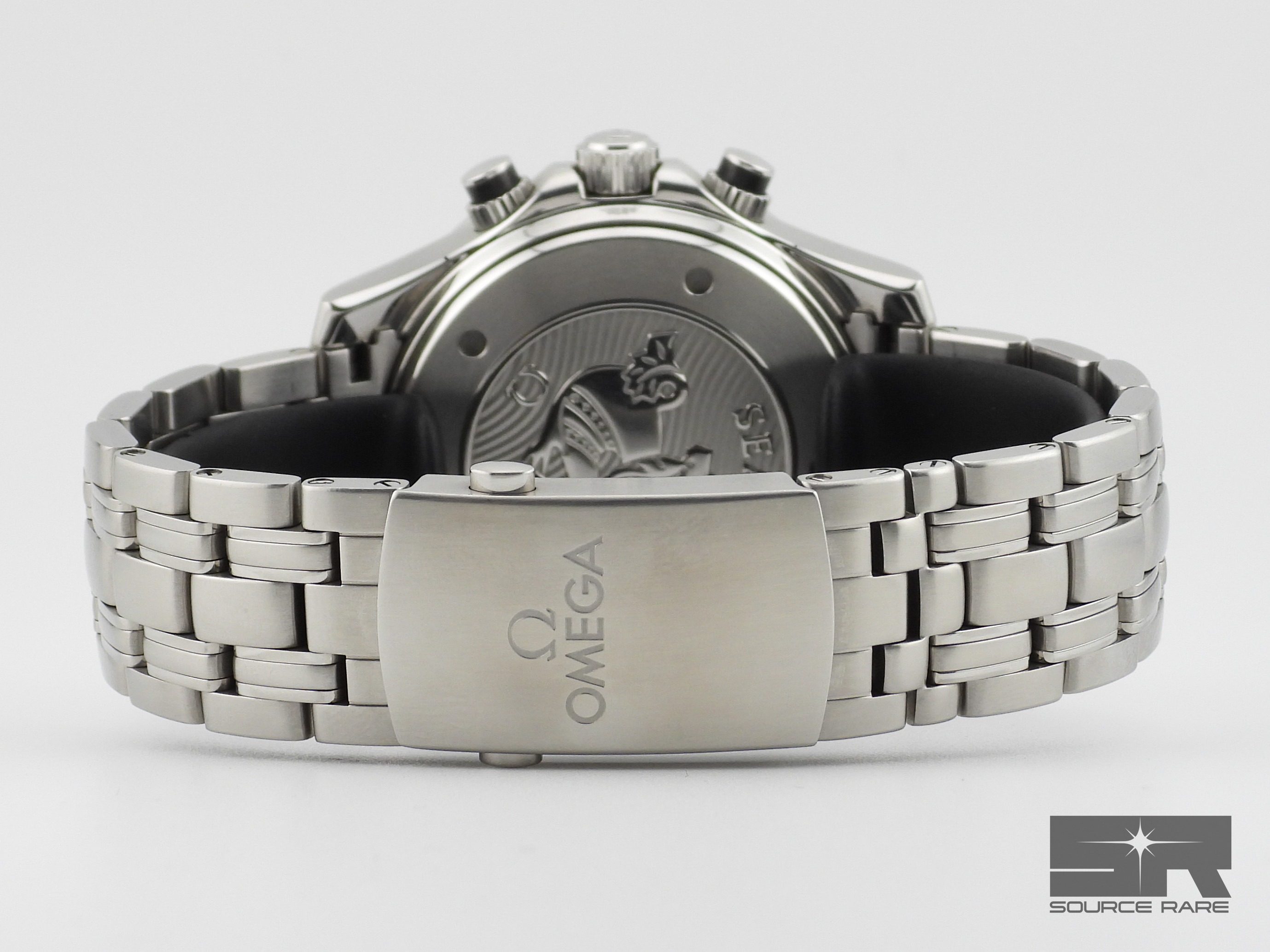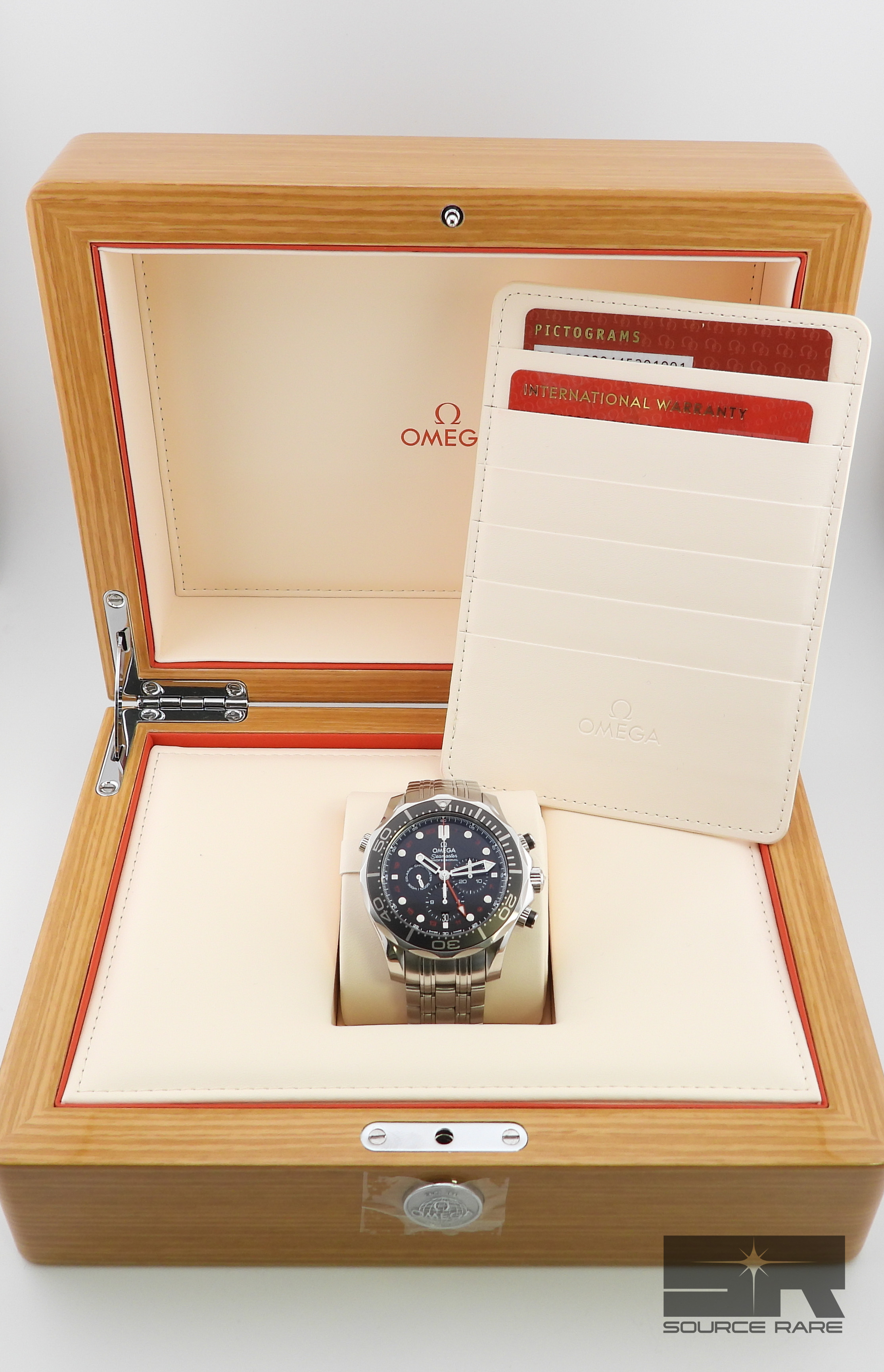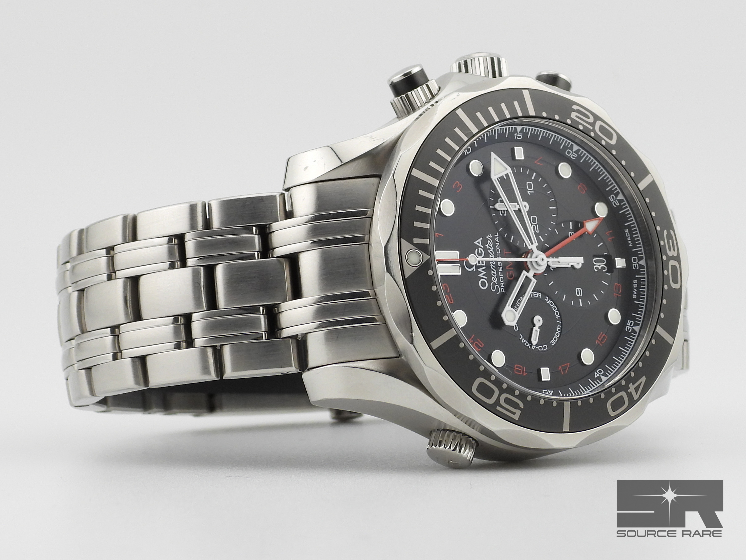 Powered by the Omega Calibre 3603 (column-wheel chronograph, COSC-certified), this model offers chronograph, GMT (second time zone), date, and a helium escape valve, wrapped into a single diver with 300m water resistance.