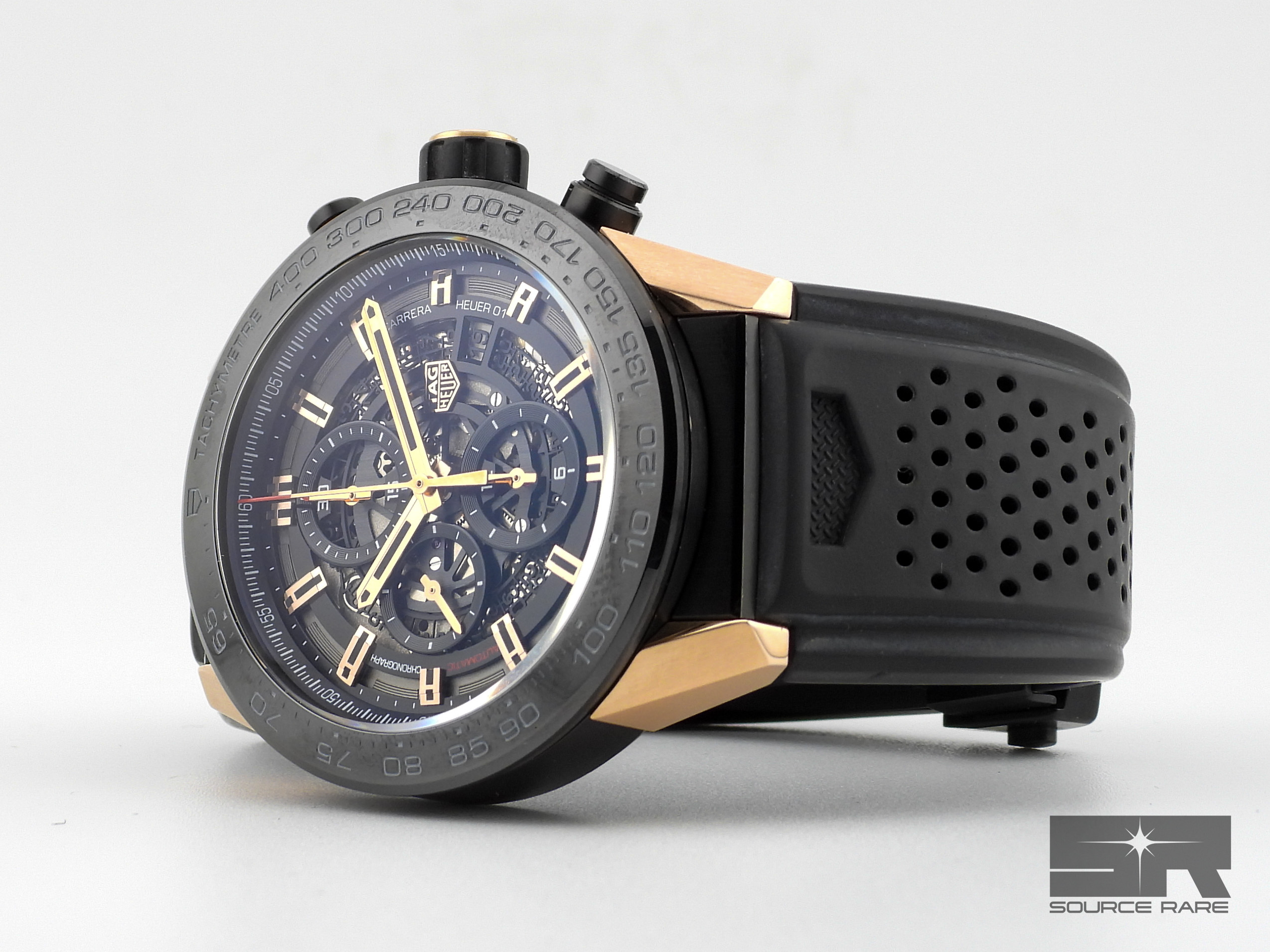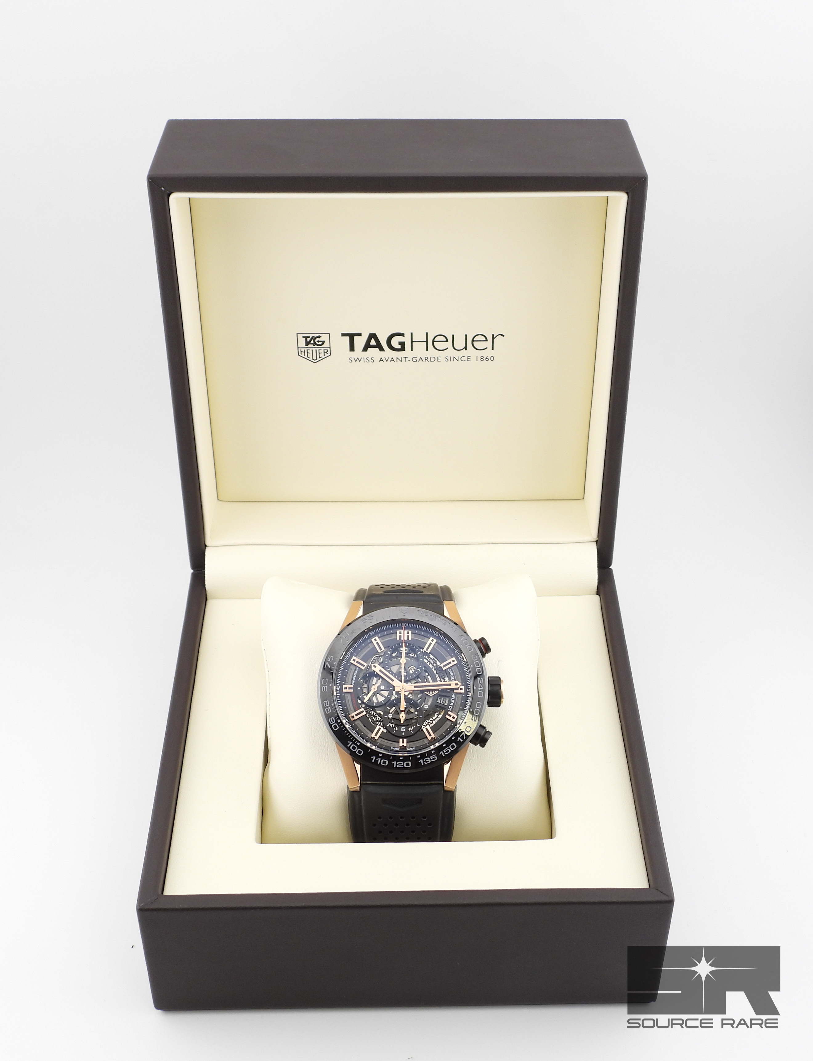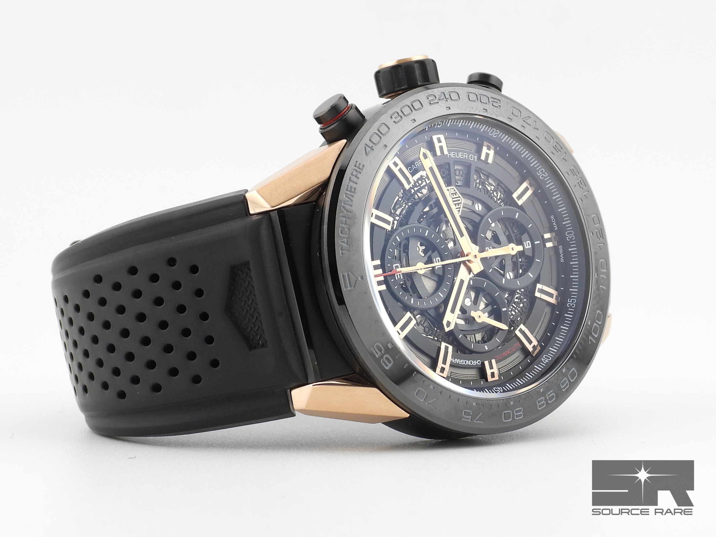 The TAG Heuer Carrera Calibre Heuer 01 Ref. CAR2A5A.FT6044 blends motorsport heritage with a striking modern design. This reference features a bold 45 mm case crafted in black titanium and rose gold, housing an open-worked dial that reveals the inner mechanics of the in-house Heuer 01 chronograph movement.